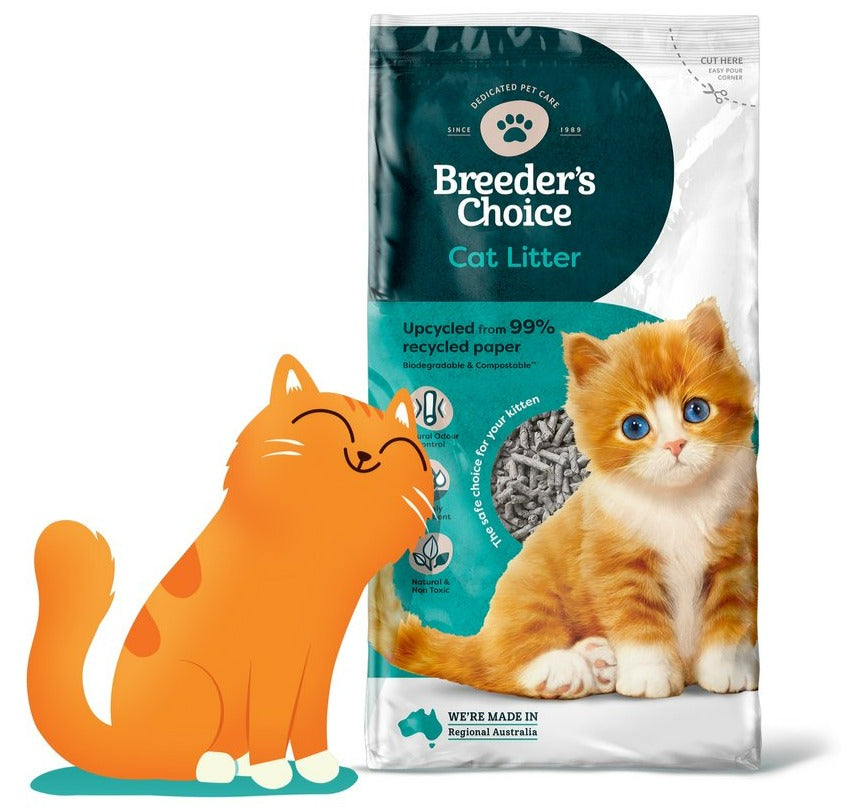 Uniquely formulated Breeders Choice cat litter pellets are made from 99% recycled paper with no additives or chemicals