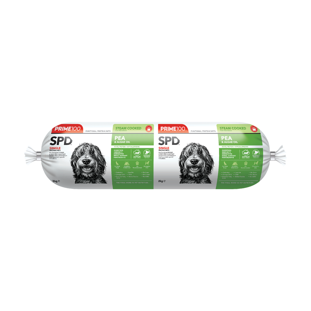 Prime100 SPD Fresh Roll Pea & Algae Oil is a novel, hypoallergenic, non-meat-based elimination diet, made specifically for dogs with suspected allergies and/or sensitivities. This diet is complete and balanced for adult dogs and contains natural anti-inflammatory and antihistamine ingredients. Formulated with essential amino acids lysine and methionine, natural digestive enzymes, and prebiotics, to help improve gastrointestinal immunity. Added taurine to support heart function, vision, and fat digestion. Low in fat, which is ideal for dogs with pancreatitis, and low in phosphorous to support dogs with renal issues.