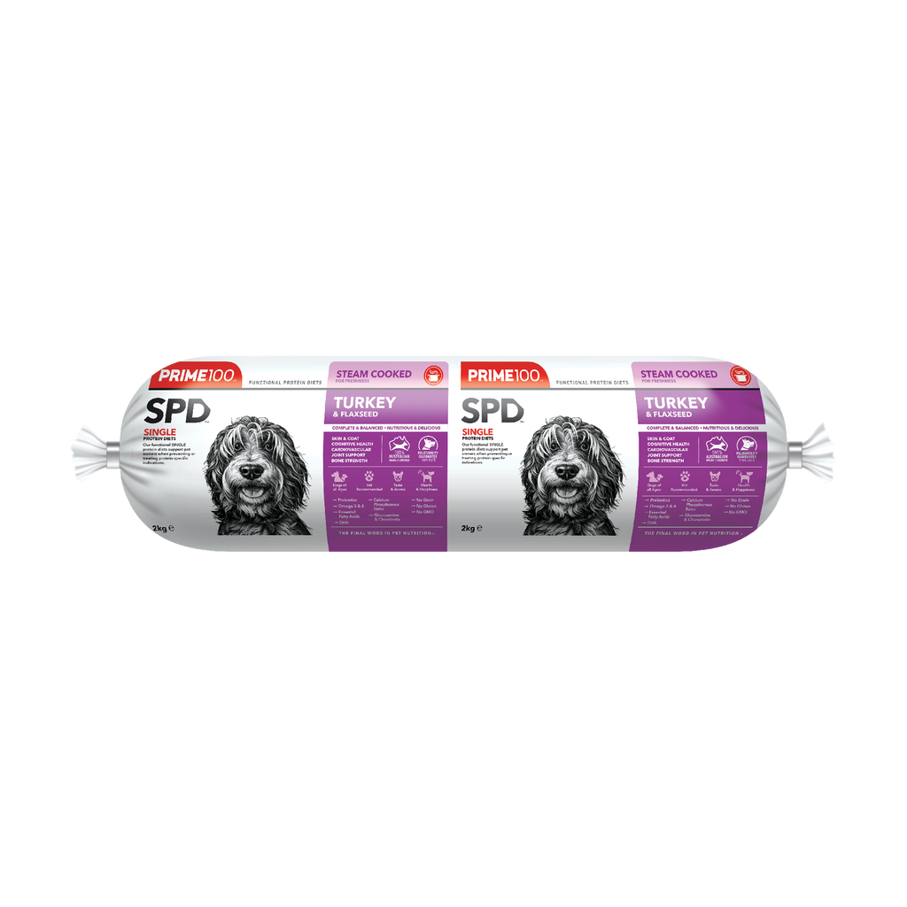 Prime100 SPD Fresh Roll Turkey & Flaxseed is a single protein diet designed to provide a single source of protein, prebiotics and fibre for dogs. Complete and balanced with a natural source of calcium, glucosamine, chondroitin, and essential fatty acids for dogs of all ages (excluding large & giant breed puppies). Formulated to improve and maintain skin health and to improve digestion through added natural digestive enzymes and fibre contained in flaxseeds. Contains added functional oils, rich in EPA and DHA for optimum joint function, bone health, and animal wellbeing. No added artificial colours or flavours.